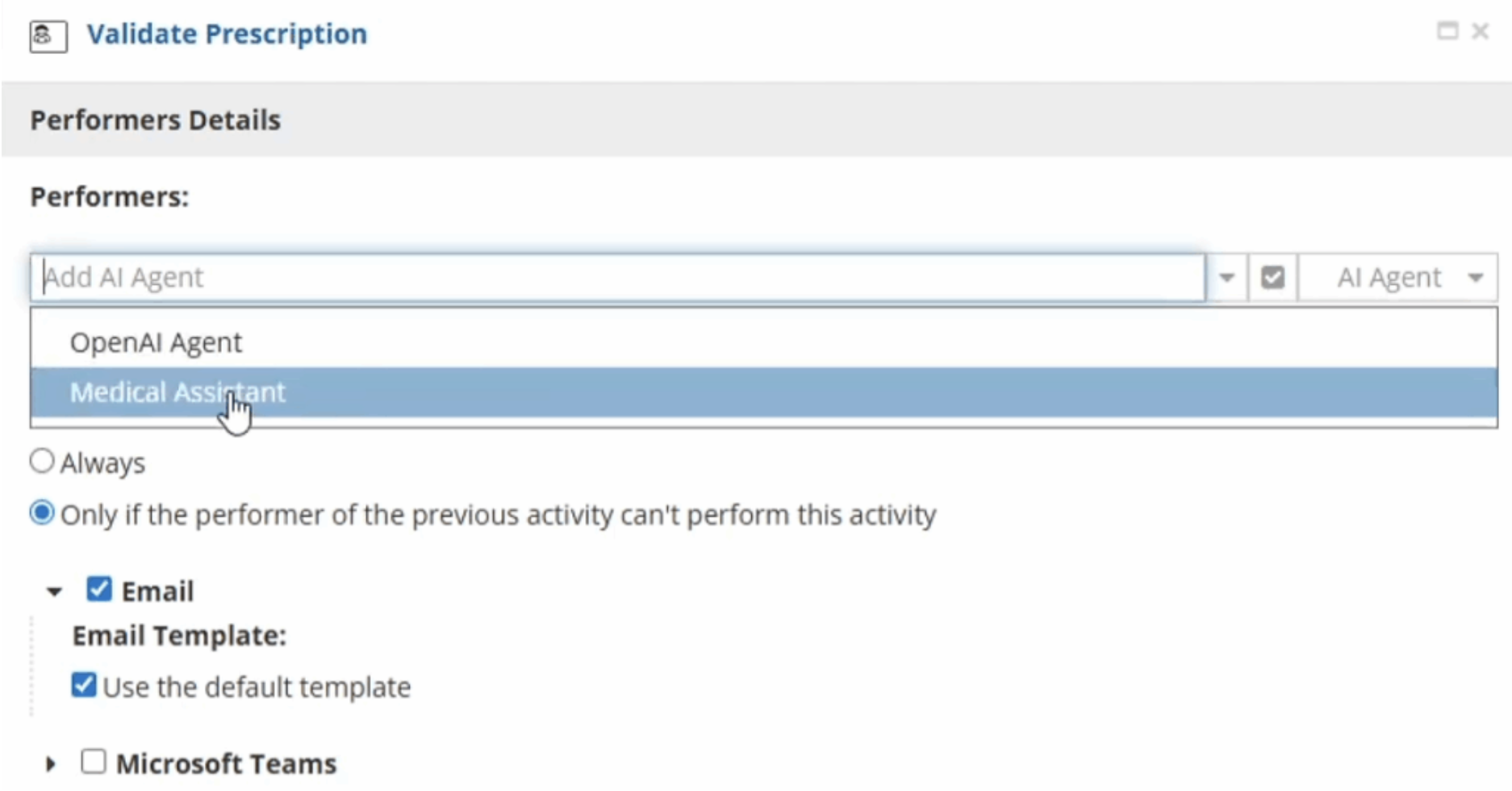 Now we can configure the Performer of the User task to be a particular AI agent type, in this case an agent called “Medical Assistant”.