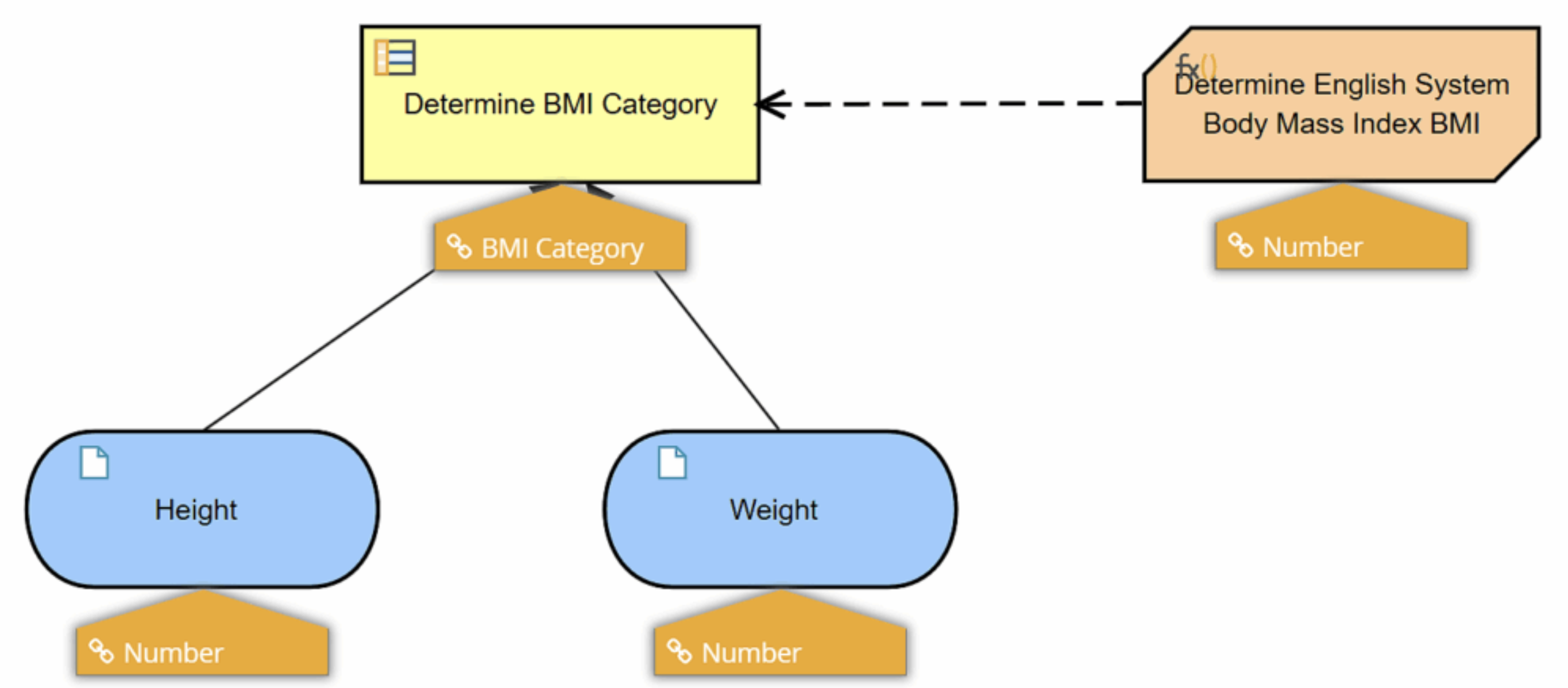 In the Trisotech Examples folder is a simple decision service, Calculate BMI Category. A BKM computes the Body Mass Index from Height and Weight, and then a decision table matches that to a category.