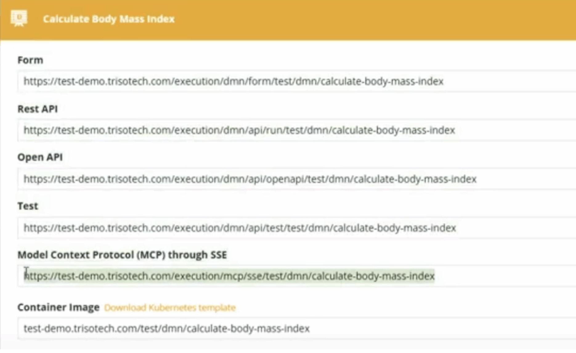 The Trisotech platform uses the BPM+ standards DMN, BPMN, and CMMN to automate decisions, workflows, and cases using graphical tools and low-code. The resulting decision, process, and case services are published to the Trisotech cloud where they are traditionally invoked by REST APIs. In addition, any of these services can now be invoked by AI agents using the Model Context Protocol, or MCP.