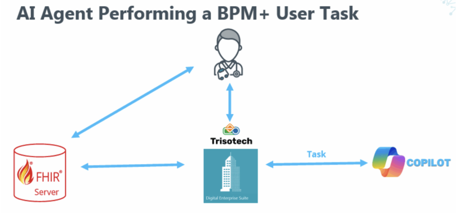 Let’s look at a Healthcare example where the user interacts with the Agent Host Copilot via Chat, which connects to Trisotech via MCP. Details of the user’s health records (FHIR Server) are invisible to the agent; only information returned by the Trisotech service is exposed.